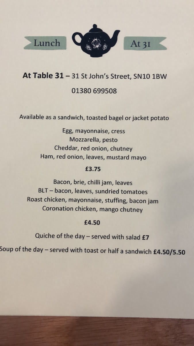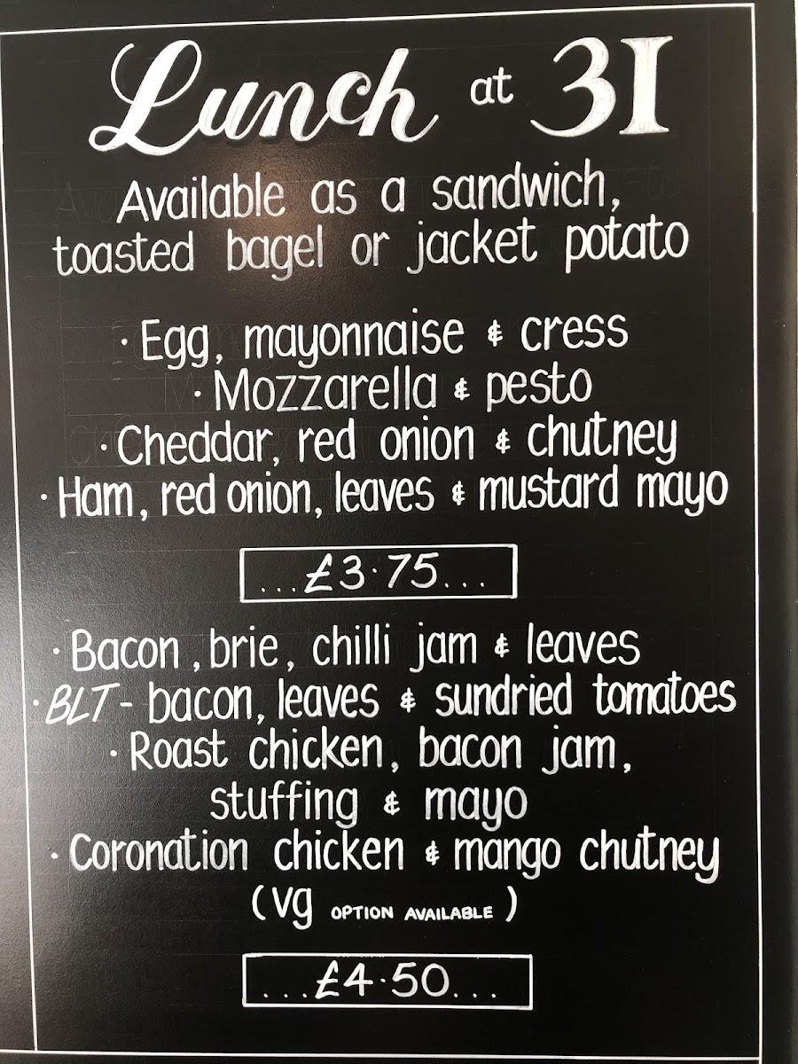 From a reviewer’s perspective, the menu at At Table 31 feels thoughtfully put together, balancing comforting classics with a few creative touches that make the offerings memorable. Dishes like the Avocado Toast with Beans stand out for their fresh, satisfying combination, while the Coronation Chicken Jacket Potato delivers a hearty, flavorful option that reflects the café’s knack for elevating familiar favorites. The addition of Coronation Chicken Mango Chutney brings a pleasant sweetness and gentle spice that adds depth and personality to the menu. Overall, the selection feels approachable yet distinctive, with well-chosen flavors and comforting portions that make the menu appealing for both a light lunch and a more filling meal, leaving a positive and lasting impression.